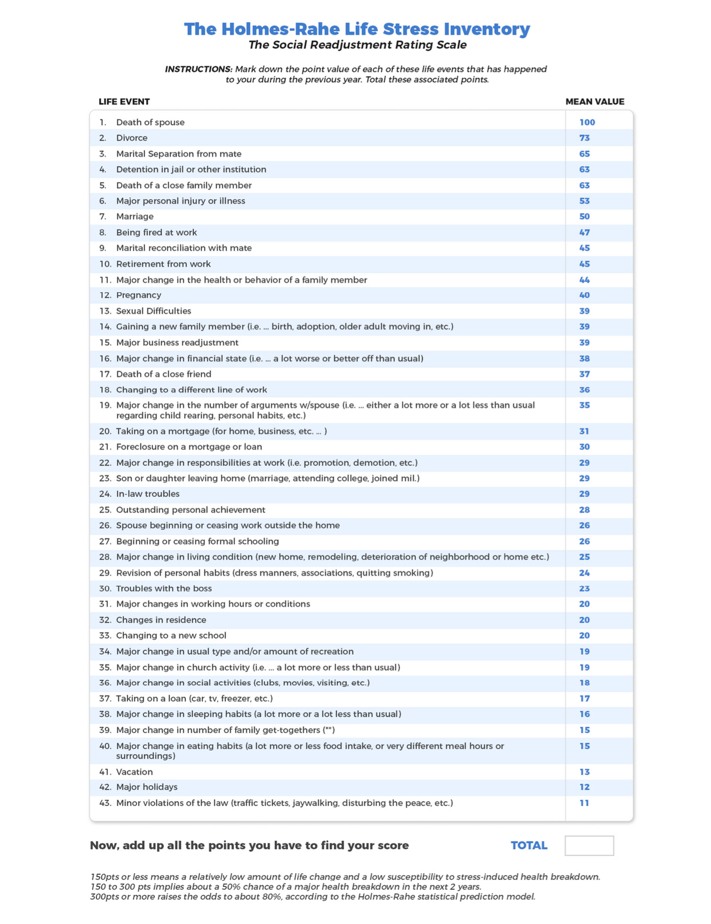 If your score totals over 300, their model predicts you have an 80% chance of falling significantly ill in the next 2 years. Even a score of 150 or more doubles your chance. This research has stood the test of time, being replicated cross-culturally in Japan and Malaysia.